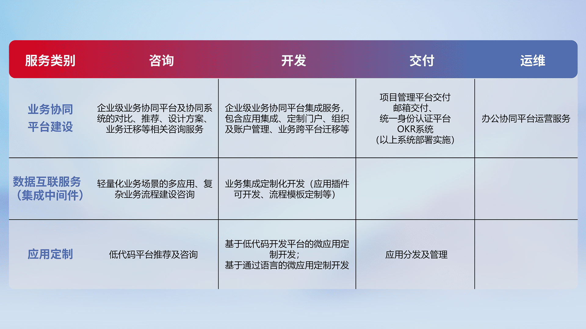 针对钉钉、、、、企微、、、IDaas等平台级产品提供产品的规划、、、方案、、、交付、、、、定制化开发等服务,,,,实现如统一协同办公、、、、智能客户服务、、、、混合会议管理、、、、智能数据查询、、、、等业务场景,,,,实现数字化转型。。。